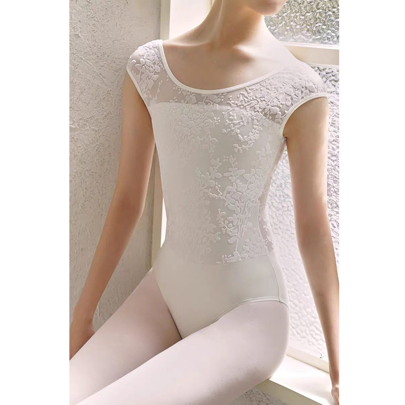 繊細な花模様のレースが全面に施された優雅なバレエレオタードです。