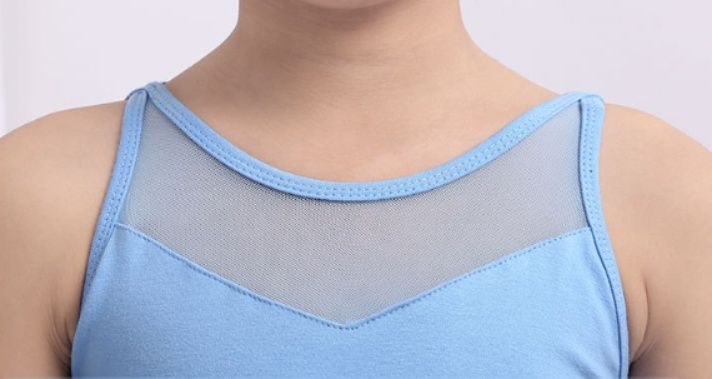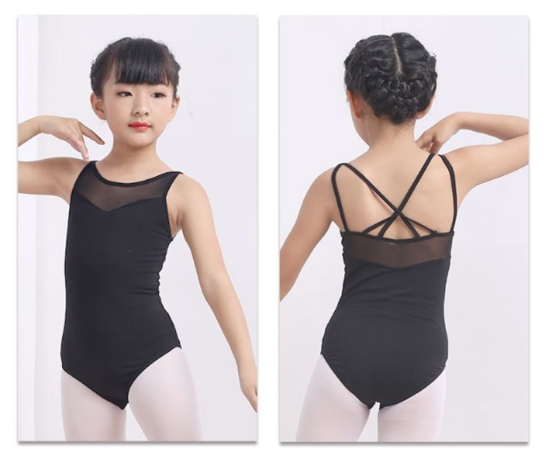 胸元の透け感のある素材が上品な印象を与えるバレエレオタードです。