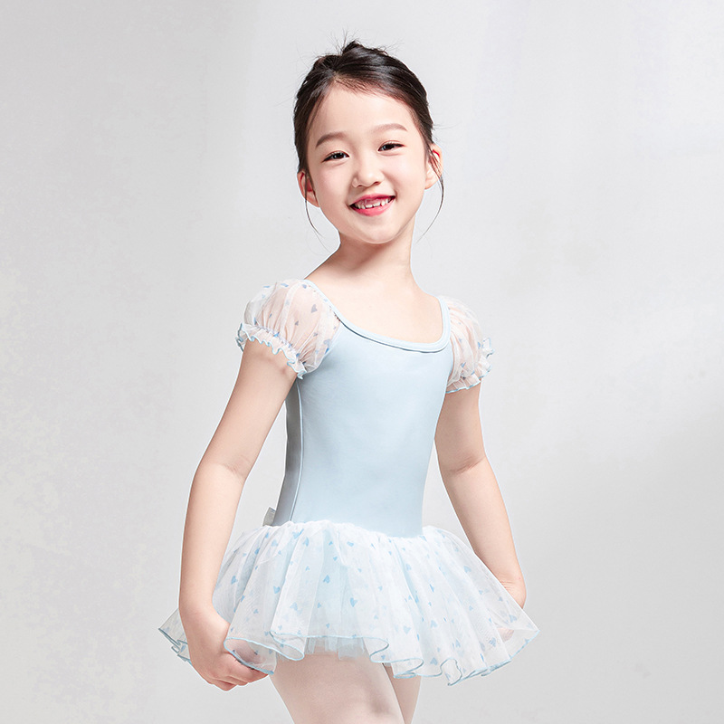 華やかな花柄の透け感あるチュール素材を使用した半袖が特徴的なバレエレオタードです。