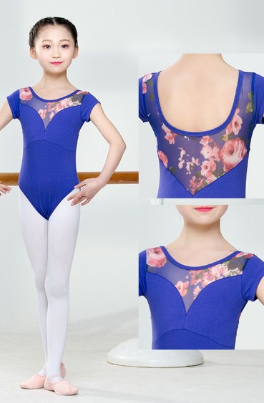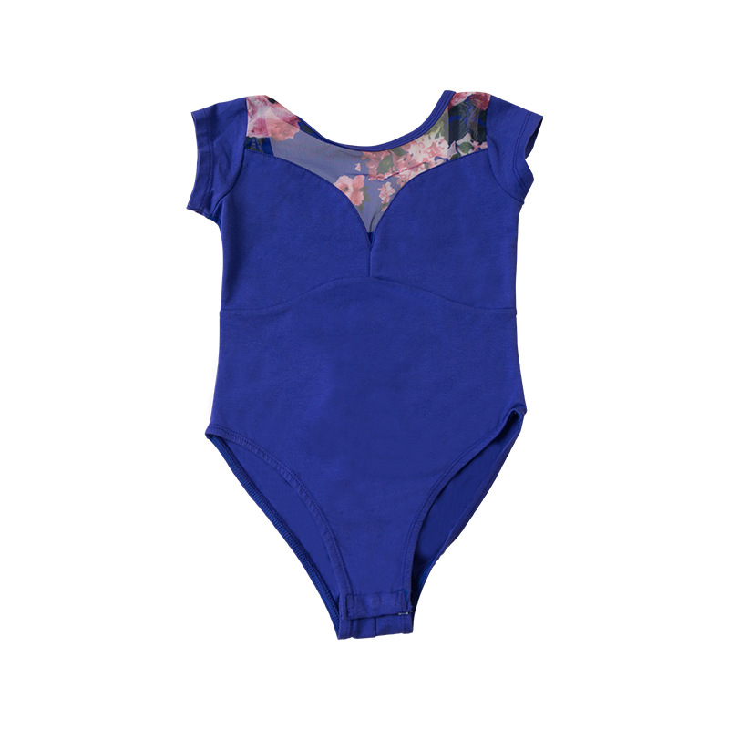 胸元と肩部分に施された花柄メッシュが華やかなバレエレオタードです。