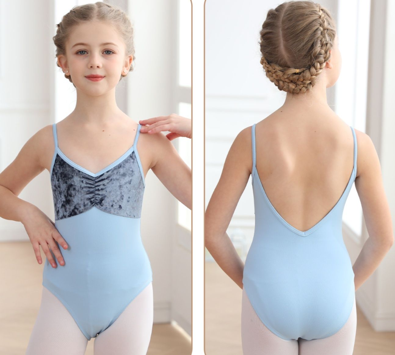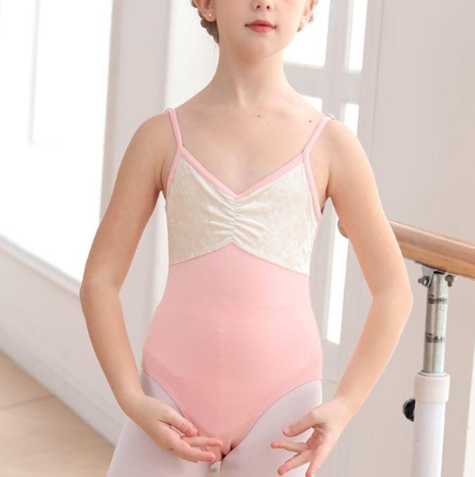 繊細なレース切替が胸元を優雅に彩るバレエレオタードのキャミソールタイプです。
